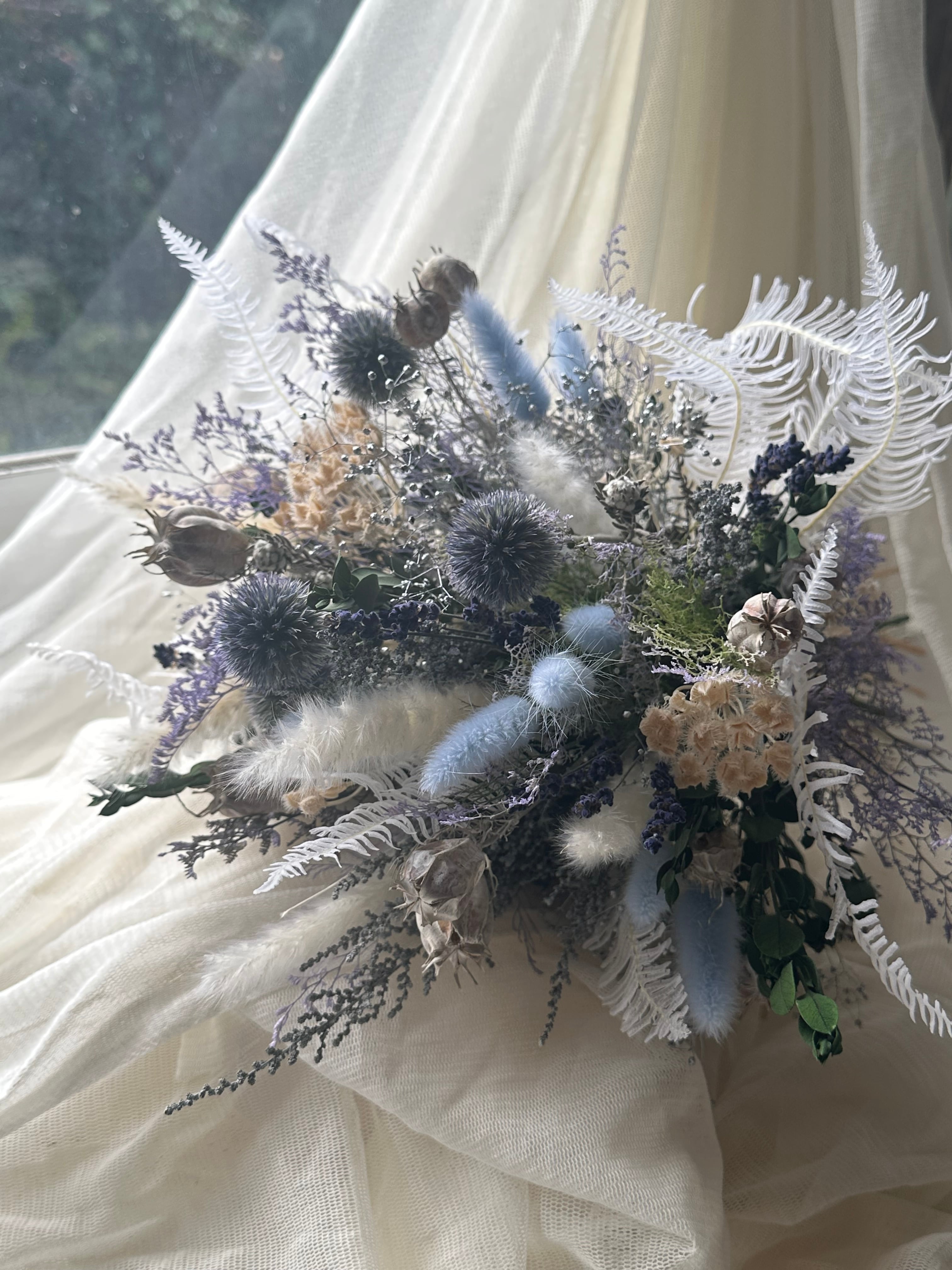 2人の幸せを願って作ったブーケです。 ハンドメイドで仕上げられた、ナチュラルなウエディングブーケ。フェイクフラワーを使用しているから、長くその美しさをお楽しみいただけます。自然な色合いと優雅なデザインで、大切な日の装いを引き立てます。一つ一つ手作業で作られたブーケは、オリジナル性が光る特別な逸品。花々の儚い美しさと共に、新たな門出を祝福する気持ちを形にしました。ブーケを手にする瞬間に、あらためて愛される幸せを感じていただけることでしょう。 このウエディングブーケが、一生の記念に残る笑顔と幸せをプレゼントします。 魔法の調合表 花言葉・・・アリウム(夫婦円満) プロテア コンパクター(豊かな心) クイーンアンズレース(可憐な心) シダ(誠実、魅力ある人) カラー・・・ホワイト(純粋、清潔) ブラウン(温もりや信頼感を与える) サイズ 横30㎝×縦50㎝ 素材 フェイクフラワー ※ご注意※ ・ブートニアはついていません。ご所望の方は+2,000円でおつくりします。 また、お揃いのヘッドパーツのご所望の方はデザインや量で料金が変わりますのでご相談ください。 ・効果は絶対ではございません。 あくまでもお気持ちのサポート役とご理解いただいた上でのご購入をよろしくお願いいたします。 ・仕入れ状況により花材が若干変わる場合がございますがデザインや意味合いは大きく変わりません。
